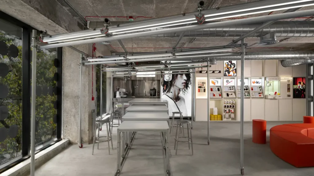 พื้นที่ขนาด 5,032 ตารางฟุต บน 2 ชั้น ได้แรงบันดาลใจจากไลน์การผลิตและเวิร์กช็อปยุค 70s เปลี่ยนเอกลักษณ์ดีไซน์ของ Nothing ให้กลายเป็นพื้นที่ที่มีชีวิตและมีส่วนร่วมจริง ๆ ใจกลางของร้านคือ “การแสดงตัวตน” ที่นี่คือที่เดียวในโลกที่ลูกค้าสามารถปรับแต่งสินค้า Nothing ให้เป็นสไตล์ของตัวเองได้ พร้อมสตูดิโอสำหรับครีเอเตอร์ ใช้ถ่าย unboxing หรือทำคอนเทนต์แบบลงมือจริง